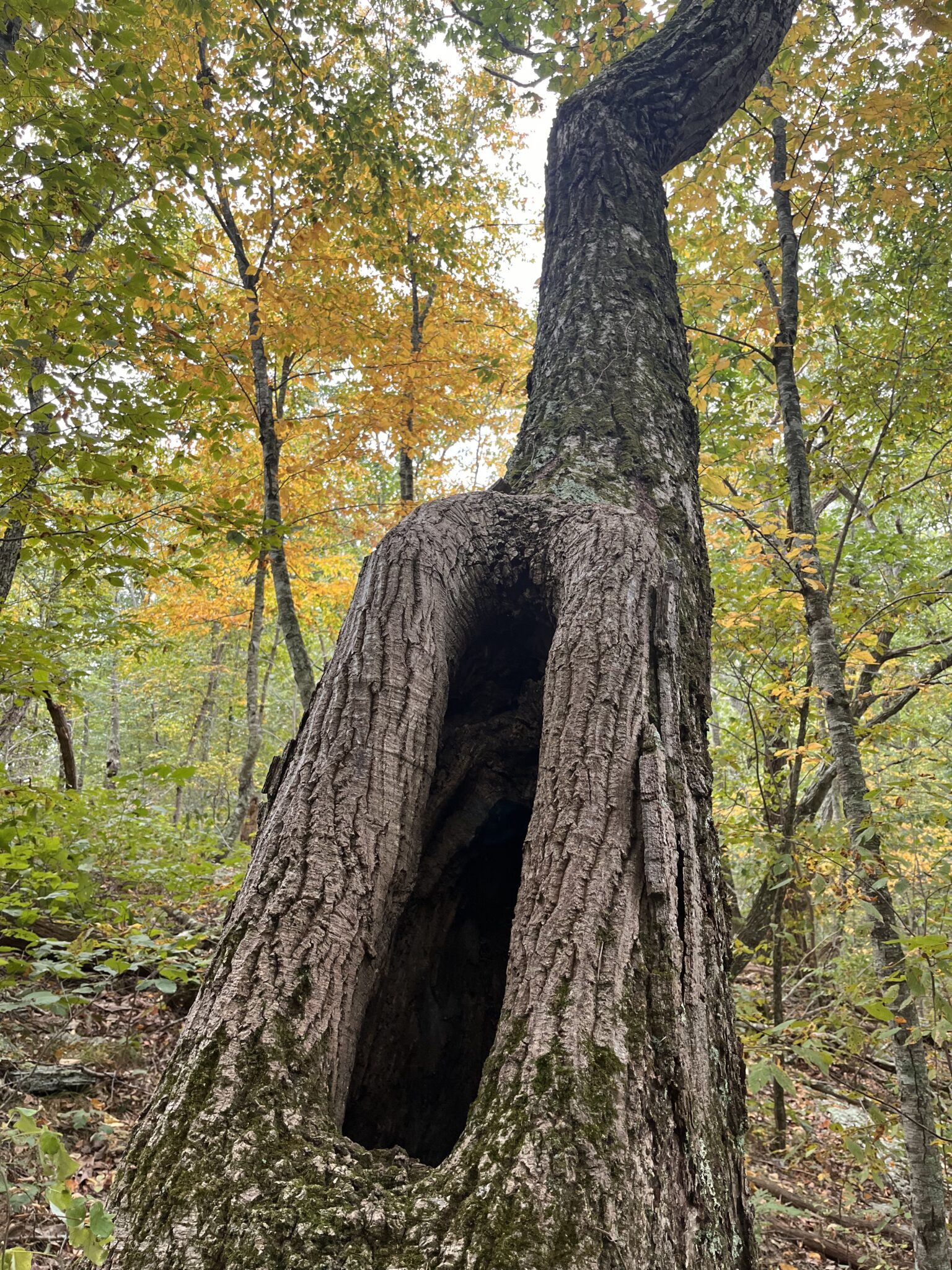 Another name for this photo could have been Persistence. In this case, David Luke has discovered a tree that suffered an unknown injury long ago and recovered by growing tissue around an oblong rectangular hole which exposes a hollow center. The living tissue and strength of the tree trunk are in the outer layers, so once healed, a tree with a large cavity can be strong and healthy. Nature is endlessly fascinating in its ability to overcome damage and heal wounds. David has composed the photo in a dynamic and appealing way. Set upon a bright background scene of delightful fall color, the division of the picture plane with the diagonal angle of the tree adds to the drama. The placement emphasizes the sculptural elements and amazing strength of the tree trunk. Thank you, David, for sharing your fascination with this unique tree. – Wendolyn Hill