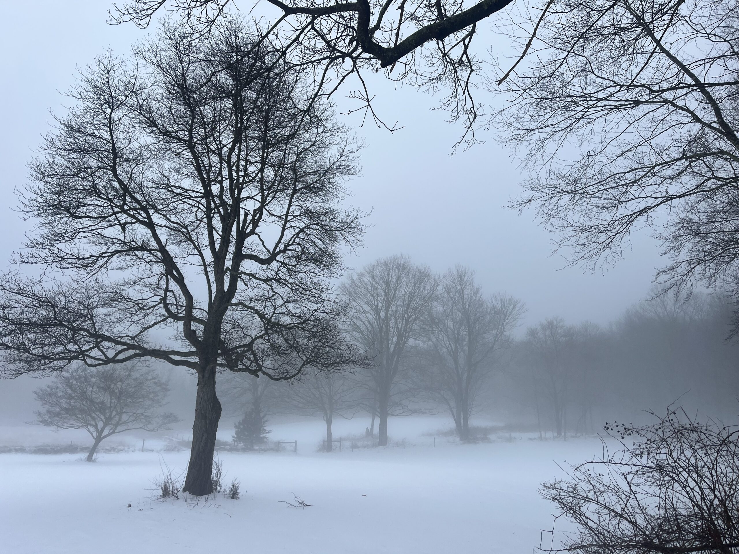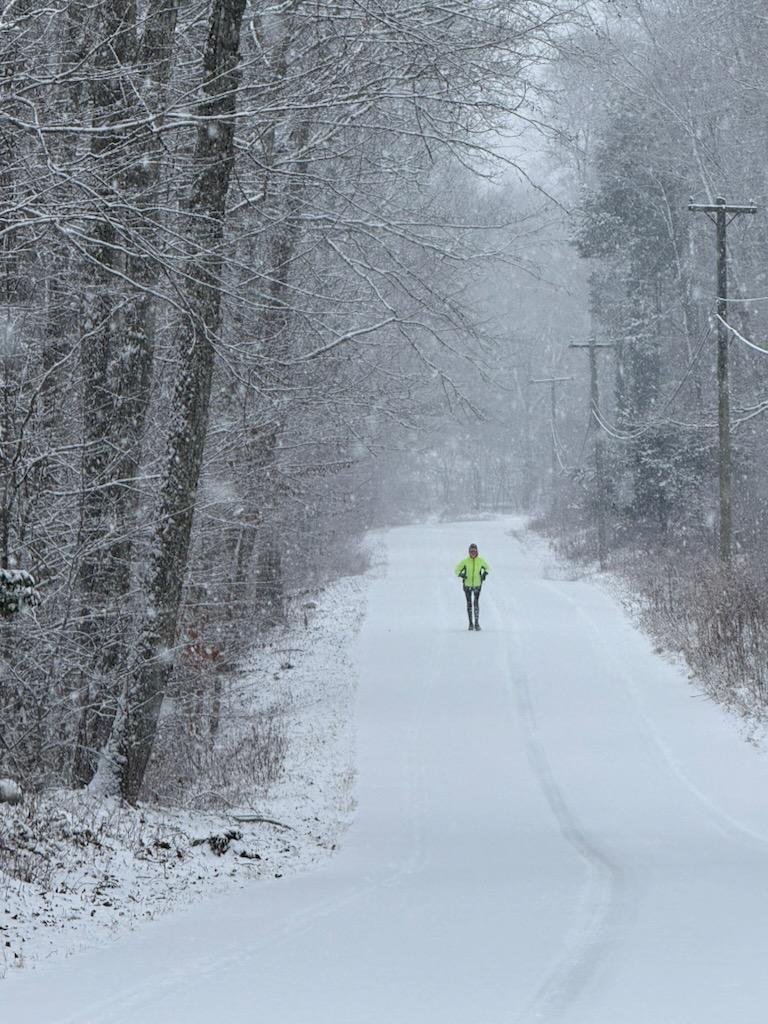“It was so much fun running that morning…no cars! My friend Diba Khan-Bureau took the pic as I was running towards her on Salem Road.” said submitter Gloria Grace-Ferri. A rare major snowfall in Lyme causes our everyday world to pause and gives us the opportunity to enjoy the peace and beauty around us, if we choose to seize the day. Without traffic, roads are transformed from dividers and obstacles into a safe conduit within the natural habitat. The direction and perspective of the snow covered road invites us in to experience a magical winter wonderland. The sense of scale with the snow covered trees towering over the tiny Day-Glo figure adds a sense of awe and fun. So fun!