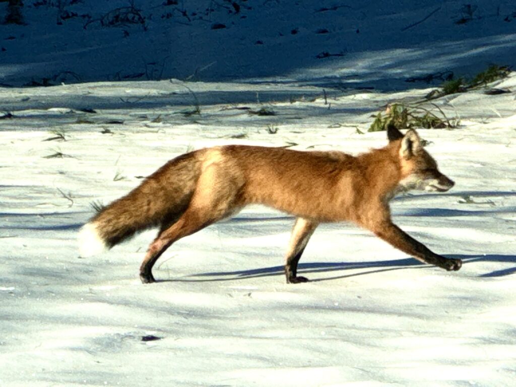 There is something very appealing about this image of a Fox trotting by. It is rare to successfully capture a photo of an animal in motion in its natural environment, seemingly unaware of the human eye watching. The gesture of the head, legs and full fluffy tail, and slightly blurred focus convey a sense of swift movement and determination in this healthy, magnificent animal. Scott took advantage of the contrast between the warm orange colors of the fox which stand out against the blue tones behind it. The cool long shadows of dusk or dawn enhance the sense of direction and movement. Thank you Scott for this awesome image!